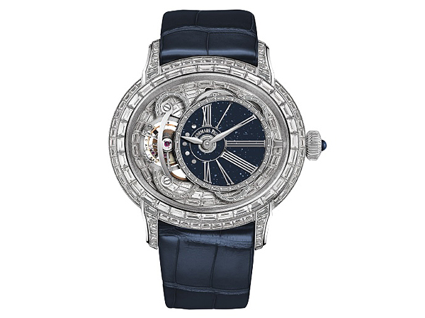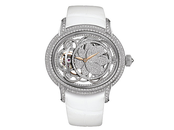 千禧鏤空陀飛輪腕錶巧妙鑲嵌鑽石, 主機板亦以鑽石作點綴, 使腕錶機芯散發出閃爍光芒。蘊含無限詩意的機芯設計融合了珠寶與機械兩大工藝。18K白金錶面,白金鑲鑽環圈,以雪花式鑲嵌花卉裝飾,搭配優雅的玫瑰金指針。
