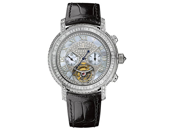 合高尚典雅的黑色鱷魚皮、鑽石與複雜功能機械裝置的卓越之作。錶圈上鑲嵌的長方形鑽石,與錶耳、錶殼側面、錶盤外緣及中央鑲嵌的圓形鑽石形成鮮明的對比,令人嘆為觀止。中央秒針與計時器指針採用藍鋼材質,格外醒目。透過6點鐘位置的圓形視窗可以欣賞腕錶心臟的振動,透明藍寶石底蓋則讓兼具計時碼錶、小秒針功能的神奇機械裝置盡收眼底。