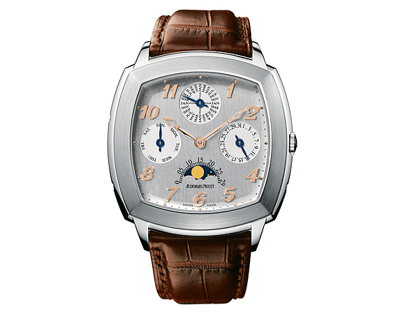 擁有獨特出眾的方枕形鉑金錶殼,施以霧面直紋拋光打磨的銀色錶盤上鑲貼著玫瑰金數字時標,其光澤與玫瑰金教堂形時分針互相輝映。四個小錶盤分別顯示星期、日期、月分、閏年與月相顯示。