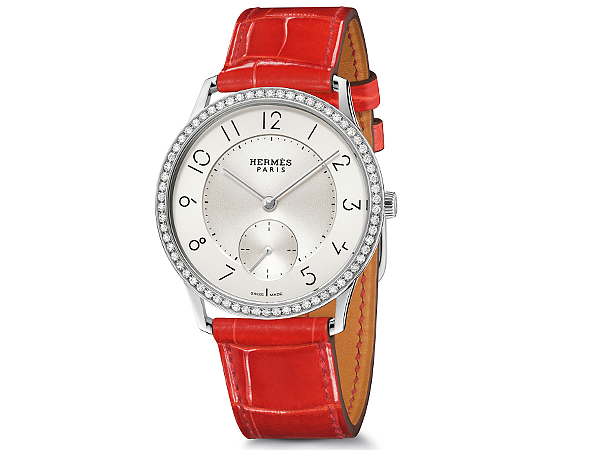 如今,女士們也能選擇配戴 Slim d’Hermès 腕錶39.5 毫米大小的款式,因為品牌為此型號裝配色彩繽紛的鱷魚皮錶帶:包括寶藍、象灰、紅橘、深紫、純黑等,另備鑲鑽款式,錶殼鑲有66顆鑽石。