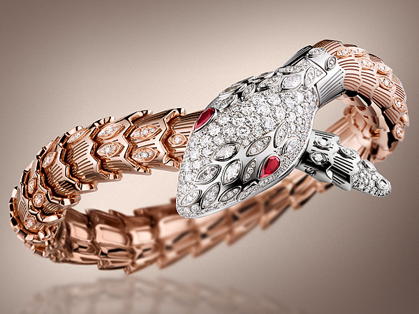 關於Serpenti,設計師Fabrizio Buonamassa Stigliani曾如此表示「蛇的身體非常柔軟靈活,儘管寶格麗已經馴化了蛇,蛇卻依然維持多變的樣貌。其中即蘊藏了腕錶系列的秘密。」寶格麗以三款全新的Serpenti頂級珠寶腕錶,賦予了蛇令人心醉神迷的魔法。其中兩款採雙圈鏈結式錶帶。一層層緊扣的金質彈簧鏈結,表層再以紅或黑色的金屬漆面構成,華美動人;而單節式的Serpenti腕錶,則讓蛇頭與蛇身交扣,再於鏈結上拼接綠松石與美鑽鑲嵌,在在展現了寶格麗在精工上的美學高度。