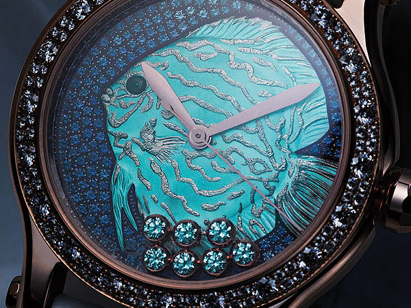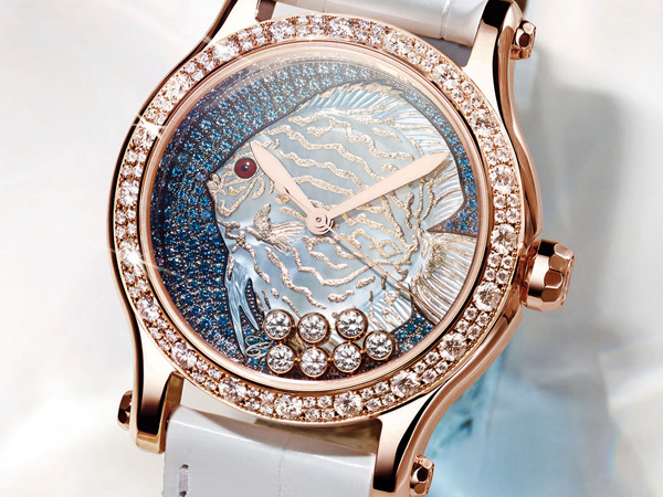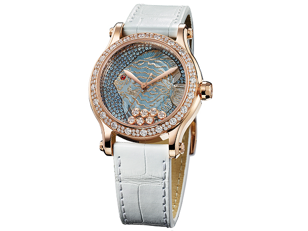 今天,精美絕倫的 Happy Fish 系列增添一款雍容典雅的錶款。全新 Happy Fish腕錶藉由出神入化的藝術工藝,向神奇的深海世界致敬。綠松石和黃金和諧交融,一條雍容優雅的魚兒躍然而出,其細微動作和流暢曲線在夜間清晰可見,藉由珍珠母貝精雕工藝,魚兒活靈活現,栩栩如生。精緻和諧的弧拱造型點綴金葉,賦予畫面柔光淡暈和細膩的光影之效,而雪花式鑲嵌漸變藍寶石則令面盤更顯流光溢彩,美不勝收。7顆晶光璀璨的旋動鑽石在連綿起伏的海浪之上輕靈舞動。在青綠色的底幕上,紅玉魚眼猶如滄海明珠,格外醒目。錶圈鑲嵌三種不同尺寸的鑽石,交錯排列,為腕錶平添一抹柔韻和璀璨晶光,而18K玫瑰金錶殼則搭配白色珠光鱷魚皮錶帶,搭載自動上鍊機芯。