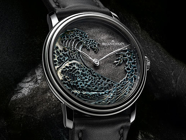 白金雕制的波浪翻滾著銅綠色澤,其外觀雕刻則以日本畫家葛飾北齋(Hokusai)創制的木刻版畫《神奈川巨浪》(Grand Wave de Kanagawa)為靈感。腕錶採用BLANCPAIN經典「簽名式」的雙層錶圈設計,錶殼為鉑金材質。