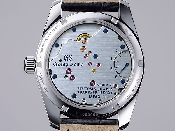 這是第一只由日本中部長野縣鹽尻市SEIKO 的微型藝術工坊(Micro Artist Studio) 所製作的GS 錶款。此工坊一向以Credor Spring Drive三問錶(Minute Repeater)、小自鳴(Sonnerie) 和 Eichi( 超薄款) 而聞名,這次很榮幸的推出8 日動力儲存的Spring Drive機芯,運用一向高品質的素材和高超的研磨技術,將GRAND SEIKO的形象推向更高的境界。為了延長動力儲存,此錶款搭配了3個發條盒。
