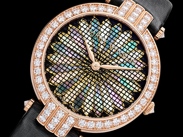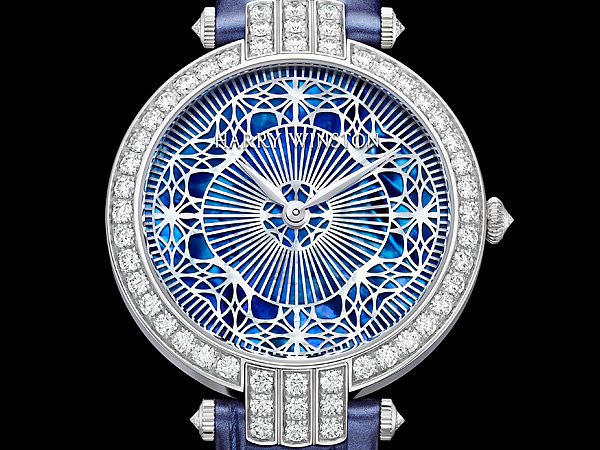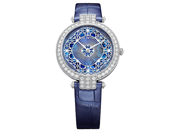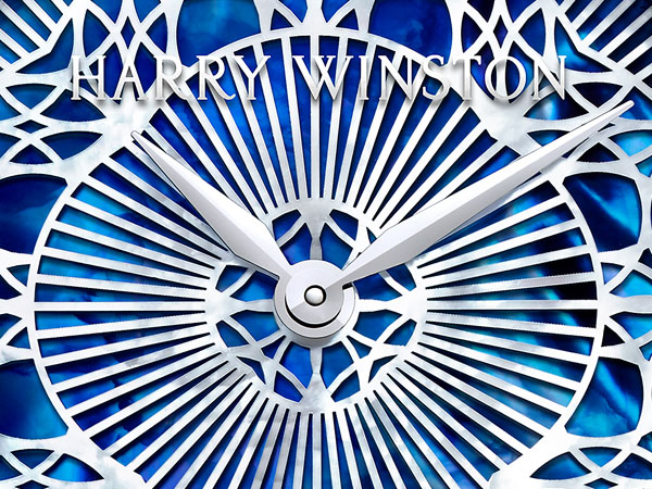 之後,鏤空薄片疊置於另一層天藍色珍珠母貝上。透過精細迷人的鏤空圖案,可見藍色珍珠母貝盤面的色彩不斷變幻,締造出美妙的對比效果、層次分明的立體感及流暢動感。光影變幻流轉,盡顯珍珠母貝虹彩般的絢麗美感。錶圈與錶耳鑲嵌57顆圓形明亮式切工鑽石,錶冠飾有一顆雍容華貴的倒置鑽石,令精雅的面盤更顯璀璨迷人。