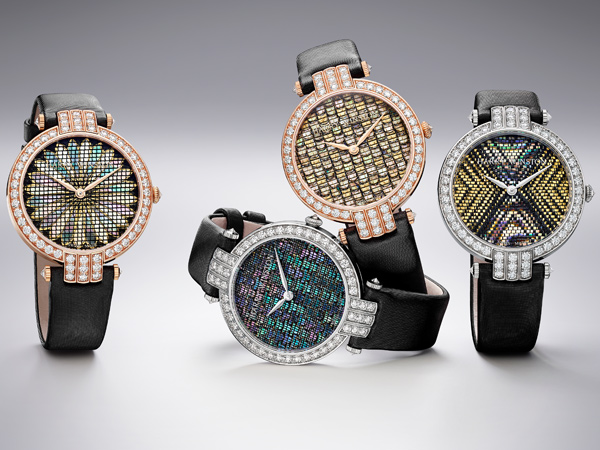 Precious Weaving 36毫米自動腕錶全新呈獻四款工藝腕錶作品,其中兩款採用玫瑰金材質,另兩款採用白金材質,搭配優雅的黑色緞質錶帶,錶殼上鑲嵌57顆圓形明亮式切工鑽 石,令腕錶更顯璀璨迷人。錶帶針扣亦鑲嵌17顆圓形明亮式切工鑽石,總重2.47克拉。