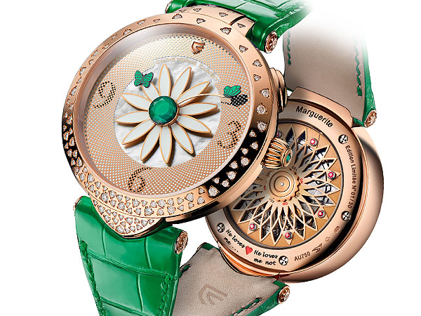 Marguerite腕錶配備一枚設雙發條盒及具備72小時動力儲存的自動上鍊機芯。透過藍寶石水晶錶背可以欣賞機芯鑲嵌8枚紅寶石、被刻成雛菊的擺輪。藏家可隨意沉醉於「他愛我,他不愛我」的遊戲之中,這個遊戲是「摘掉雛菊花瓣」的英文簡易版,是中世紀時期的女性玩意。遊玩時腕錶必須放置於水平位置,錶主必須輕輕搖動腕錶一至兩下,令擺輪轉動數秒後靜止,最接近紅心的紅寶石會顯示答案──中心會顯示「是」或「否」。