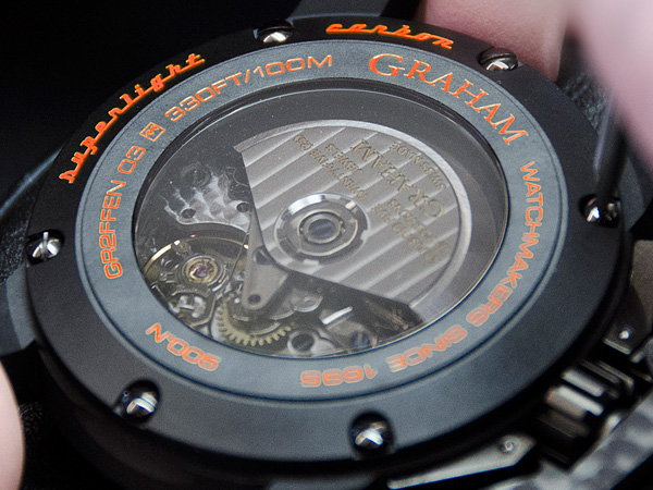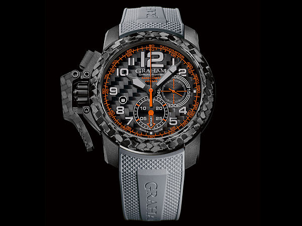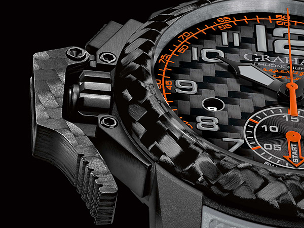 GRAHAM研發以碳纖維製造的改良版Chronofighter超輕碳腕錶。錶殼是由高減震的碳粒子綜合複合材質製成;中間部分的炭基複合物直接以高頻立方硼氮化物(CBN-超耐磨材料)的工具切割成固體形狀,Chronofighter超輕碳腕錶的總重量輕於100克。