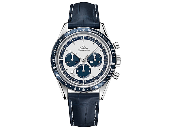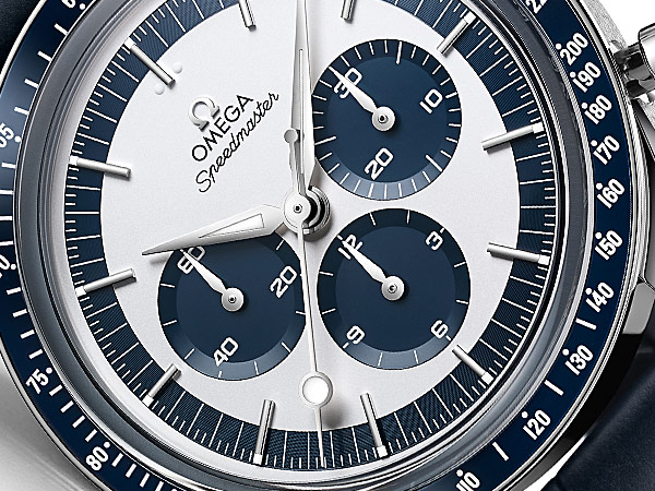 歐米茄超霸 “CK2998”限量版腕錶的藍色調子最注目。腕錶的三個小面盤、分針走圈和底部設有測速計刻度的光面陶瓷錶圈均採用藍色;測速計的刻度經夜光塗層處理,即使在昏暗環境也可清晰顯示。皮革錶帶同樣選用藍色,並飾有「杏色」明線及光面錶帶扣。
