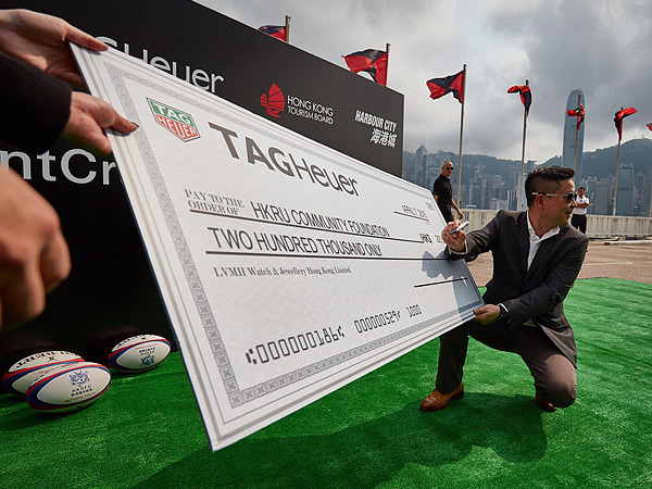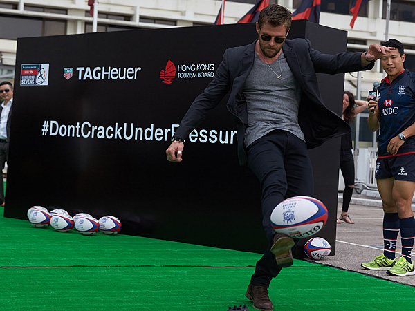 剪綵儀式結束後,一眾嘉賓從海港城專門店移步到頂層露天停車場舉行啟動禮。本次活動除了慶祝品牌成為香港七人英式橄欖球賽官方計時,更為香港英式橄欖球總會社區基金籌款,以支持本地英式橄欖球發展。Chris Hemsworth、Loic Biver及三位香港英式橄欖球隊員現場一展身手,分別將橄欖球踢向球門,為香港英式橄欖球總會社區基金籌得港幣20萬元。