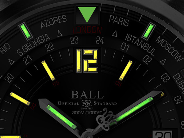 源自尖端的瑞士科技,BALL Watch H₃自體發光微型氣燈令佩戴者可在最黑暗的環境中清晰讀時。BALL Watch將H₃氣體密封在微型玻璃試管內,當H₃氣體粒子撞擊管內的內部著色表面時,光能量就會被釋放出來。這現象可以持續長達25年,而無需任何外界光線或能源作補充。世界時間盤的刻度及腕錶的指針上配有綠色的氣燈,而面盤中央的刻度則是由31支黃色氣燈所組成,自體發光微型氣燈的亮度比一般傳統的夜光塗漆高100倍。