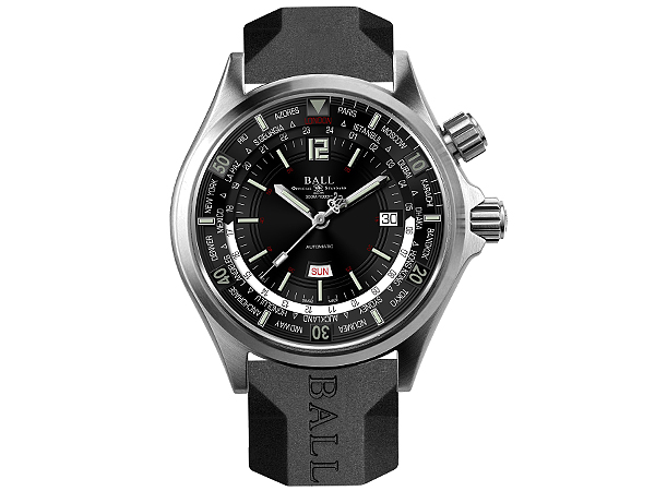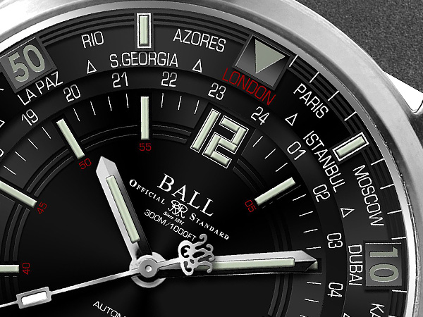 為了應對今天的全球使用環境,這45毫米型號包含由瑞士製造的自動BALL RR 1501機芯,具備時、分、秒、星期、日期顯示和世界時間等功能。位於中央的三指針顯示本地時間,而24小時盤以相反的方向自動旋轉,同時顯示24個不同時區的時間。