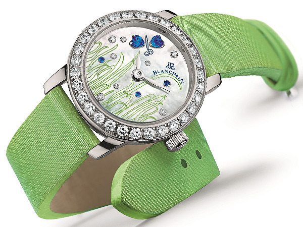 寶鉑錶BLANCPAIN以荷蘭後印象派名畫-梵谷的<鳶尾花>靈感,以珍珠母貝面盤為畫布,雋逸唯美的彩繪工藝呈現出鳶尾花葉楚楚動人之姿。雙心形狀藍寶石鑲嵌與寶藍色彩繪繪出栩栩如生的藍蝶,與星星點綴的藍鑽與白鑽鳶尾花朵融為一體。錶圈一圈美鑽、綠色絹質錶帶,超薄18k白金錶殼搭載6150全世界最小自動上鍊機芯,寶鉑經典柳葉針時分指針,錶背透明藍寶石水晶可欣賞微型自動盤小巧精緻的旋轉運動。
