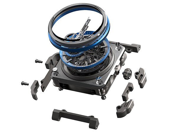 錶殼中還集成有橡膠握把功能,即便是戴著手套,也能更輕鬆地啟動計時碼錶的相關功能。最後,該腕錶以石灰色和鐵藍色為主要色調,特別是在使用短時測定功能時,這是對兩種與太空探索密切相關的顏色的巧妙參照月球的灰色和地球的藍色。