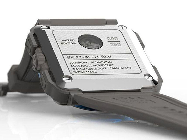 BR-X1 HyperStellar猶如火箭般堅韌,其中,45毫米厚的錶殼採用鈦鋁合金製成,這一創新設計令其十分出眾。錶殼的錶蓋、中心和鑲邊均由拋光微噴射5級鈦金製成,而錶圈的防護嵌件則採用藍色陽極氧化鋁,使其兼具輕盈與強度。為保護其在任務中免受碰撞,BR-X1的方形錶殼上覆有微噴射鈦金屬和橡膠材質的錶環,起到環繞邊緣的保護殼的作用。
