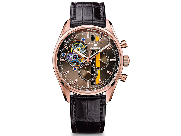 作為「50週年誌慶」的ZENITH El Primero Chronomaster 1969 Cohiba Edition獨家紀念腕錶限量推出50只玫瑰金款和500只不鏽鋼款,閃爍的栗色光澤令人聯想起著名雪茄的琥珀色調。為了向頂級雪茄致敬,腕錶以古巴品牌的代表性圖案及垂直線條跨越哈瓦那棕色面盤。工廠的廠徽──著名的Taino印地安酋長頭像也與ZENITH LOGO並列。