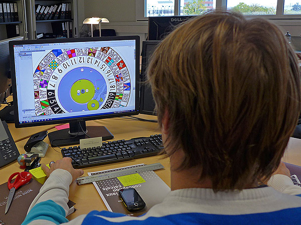 Escale Time Zone的面盤以路易威登訂製行李箱的幾何圖案和彩色標誌為基礎。彩色條紋、標誌符號、名字縮寫和其他幾何圖案都運用傳統工匠技藝,轉印到面盤上。工匠運用手工移印技術,運用矽膠版將圖案鏤空處的油墨轉移到面盤上,每種顏色都要重複一次。這樣才能確保精確圖案適合所有造型和平面設計的需要。