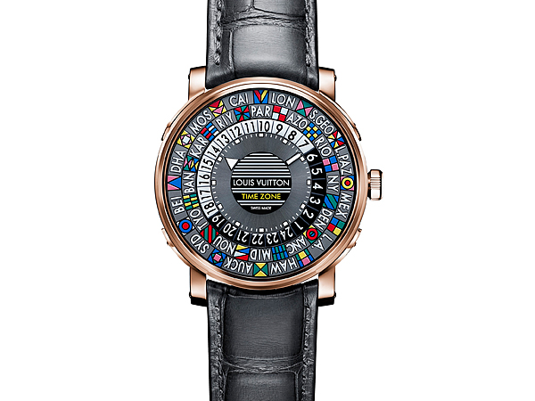 路易威登LOUIS VUITTON於2015年發表Escale Time Zone腕錶,本錶款代表更精緻的新版。新版以玫瑰金(錶圈、錶耳、錶冠)和不鏽鋼(錶殼)製作,以全然原創與直覺化的方式呈現24個時區,以嶄新角度切入GMT功能,機芯更是針對當前的探險家設計,可說是以現代方式詮釋環球旅人最愛錶款。