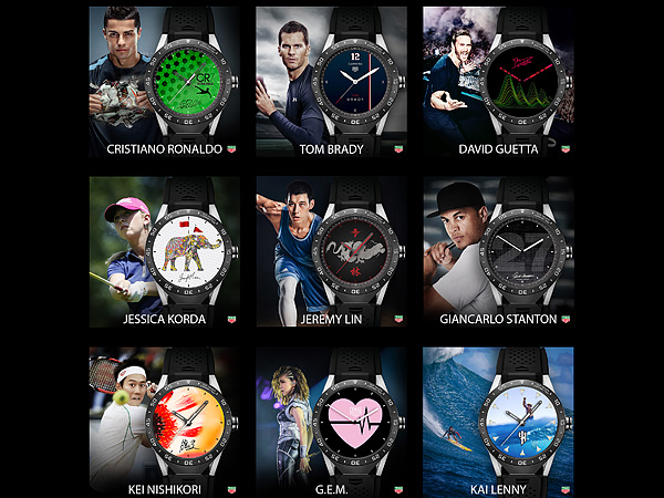 為帶來更齊全的系列,11款由TAG Heuer品牌大使精心設計的原創錶面現在可至Google Play商店下載。品牌大使包含林書豪(籃球),C羅(足球),David Guetta及the Nervo(音樂),湯姆•布雷迪(美式足球),錦織圭(網球),及賈恩卡洛•斯坦頓(棒球)等等,皆各自以其獨特方式,參與了TAG Heuer Connected腕錶的成功。