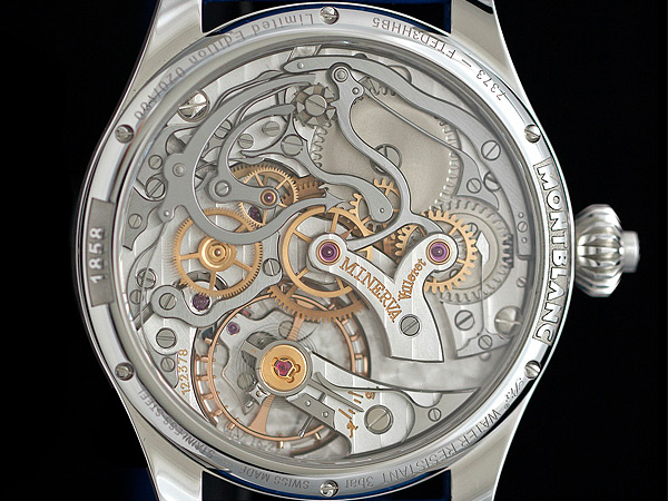 從透明的錶背可欣賞經典的V形計時夾板橋,這項設計自1912年起便為Minerva錶廠計時器的一大特色。除此之外,萬寶龍1858系列藍色測速計時碼錶限量100亦具有現代萬寶龍Minerva機芯均配備的Minerva錶廠箭頭形計時擊錘,其他特色包括大螺絲擺輪與鵝頸式微調器。機芯共含252個組件,振動頻率為2.5赫茲,動力儲存可達50小時。