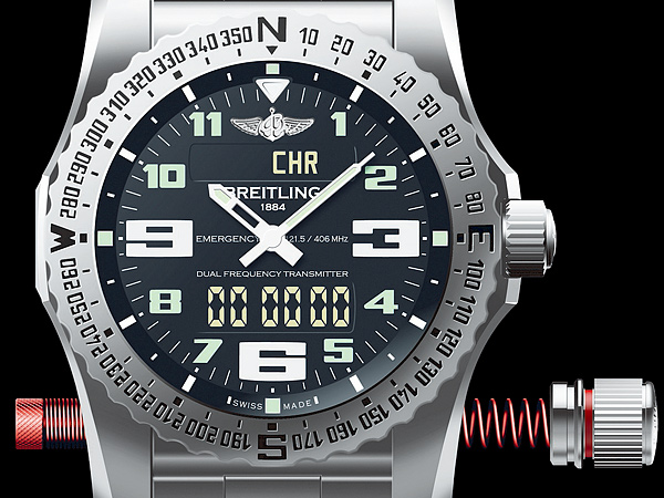 百年靈全新Emergency緊急求救腕錶根據全球衛星搜救系統(Cospas-Sarsat)的特殊要求,配備了兩種不同頻率信號的微型發射器,而為了小巧緊密的結構量身設計出可發射兩種頻率的全新軌道,百年靈與一家專精於航空、國防和工業專業研究機構共同研發的產品,成功將發射器微型化,符合手腕配戴的尺寸,樹立製錶技術領域的新基準。