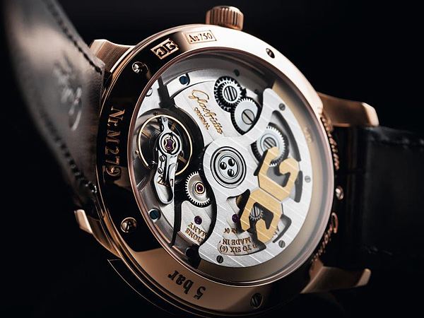 全新機芯毫不吝於向外界展示其內在及外在之美。透過藍寶石水晶錶底蓋,能立即欣賞到格拉蘇蒂最經典的裝飾及結構特色:獨具特色的四分之三夾板和帶21K 金質擺錘的鏤空自動盤、精緻的直條飾紋、珍珠紋、藍鋼螺絲,還有齒輪和自動盤軌道上的各種精緻裝飾。另一巧妙的亮點是優雅的手動上鍊機構特意以全景方式呈現 — 當為腕錶手動上鍊時,奇妙的運轉過程便展露無遺。