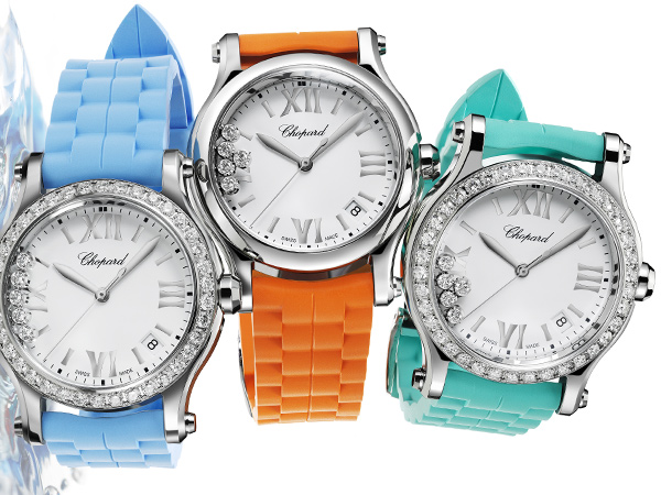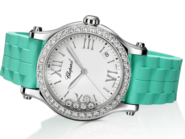 Happy Sport以不鏽鋼材質錶殼與5顆璀璨的滑動鑽石,錶帶背面更鐫刻銘文「Be Happy」,宛如珍藏的幸運寶物,搭配上可供額外選購之蕭邦全新彩色橡膠錶帶,推出夏日水藍、湖水綠以及亮橘色之三色橡膠錶帶可供選購,將繽紛的色彩帶入生活中,完美展演豔夏的活力色彩。