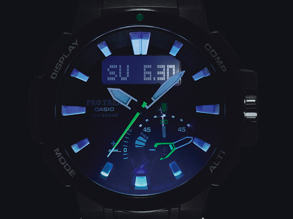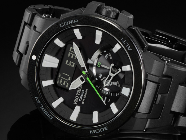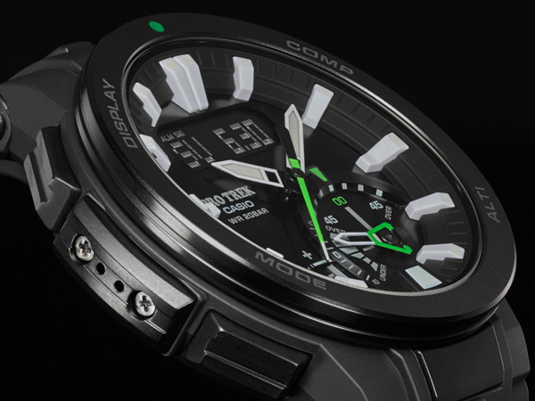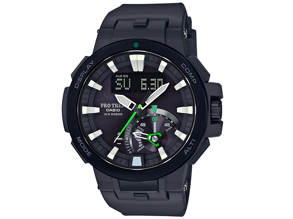 PRW-7000外觀以沉穩的黑色為設計主軸,搭配指針、錶盤細節處與錶圈點綴上綠色或土黃色調,簡約的錶盤與上方超大STNLCD 顯示,提高LCD顯示的黑白對比,雙LED照明除了照亮液晶顯示外,在指針和整點時刻加上特殊塗料,可透過LED霓虹照明照亮整個面盤,加上防眩光的藍寶石玻璃錶面、大型指針與3D立體整點時刻,讓佩戴者可以輕鬆閱讀各種資訊,貼心的”指針隱藏設計,當使用高度/氣壓與溫度功能時,指針會自動避開下方液晶區域,讓使用者閱讀各種資訊時更加直覺與便利。
