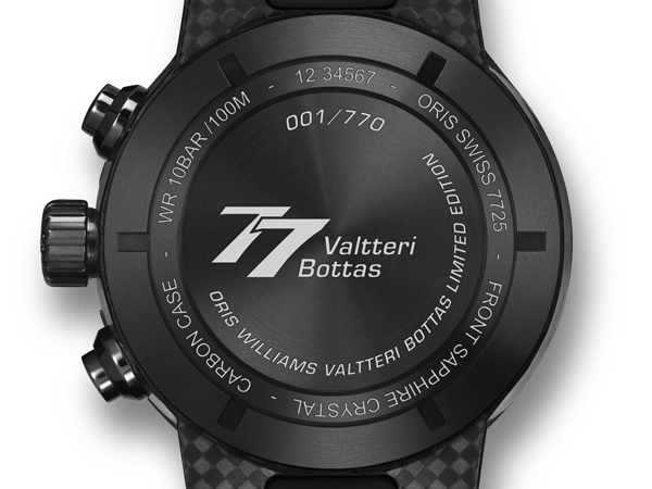 此款限量錶也使用碳纖維面盤搭配橡膠錶帶,黑色DLC塗層鈦金屬折疊錶扣;充分反映Williams F1賽車的空氣動力學設計。錶背黑色DLC塗層鈦,並刻有Bottas車號77和他的名字。
