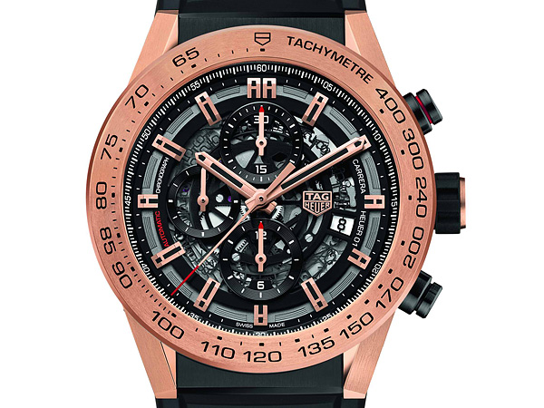 45毫米鈦金屬錶殼搭配18K玫瑰金錶圈不僅品味出眾,鏤空面盤設計更能一窺Calibre Heuer 01自動上鍊機芯運轉之美,搭配黑色橡膠錶帶,最適合熱愛運動的都會型男佩戴,建議售價NTD432,000。