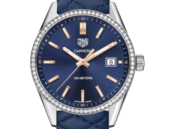 不僅如此,今年TAG HEUER的CARRERA系列以“The timeless luxury watch for elegant ladies”為口號,推出多款令仕女名媛一見傾心的女錶傑作。例如CARRERA Lady部份主打39毫米石英款的藍面鑽錶,此錶款最迷人之處在於多種珍貴材質的交錯運用,經典的CARRERA圓形錶殼飾以72枚頂級Wesselton鑽石,搭配時興耐看的藍色面盤,以及玫瑰金指針與時標刻度,交織出美感絕佳的仕女時計傑作,而藍色菱格紋皮革錶帶也為錶款注入更豐富的時尚感,建議售價NTD136,100。