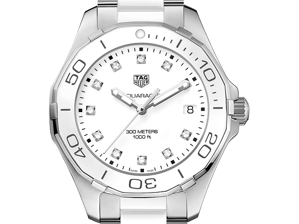 另外,亦有針對女性推出AQUARACER Lady,尺寸縮小至35毫米的不鏽鋼錶殼,更加貼合東方女性的手腕,搭配白色陶瓷與不鏽鋼交錯的錶圈及白色面盤,氣質清新,但同樣具備300米防水實力,建議售價NTD65,300。