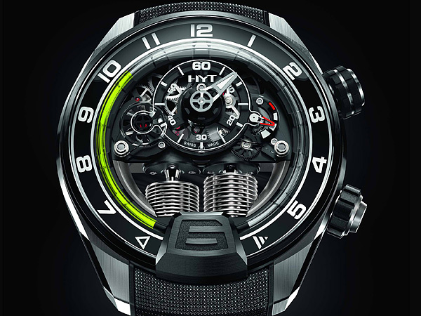 直徑51毫米,鈦金屬與鈦合金DLC黑錶殼/ HYT獨家鏤空手動上鍊機芯,每小時振頻28,800次(4赫茲),動力儲存65小時/逆跳綠色液體小時顯示,分、秒指示,動力儲存指示/藍光機械式模組:4 :30位置是上鍊以及按鍵系統錶冠,當4 :30位置的錶冠緊緊壓住,模組便可正常運作;只要錶冠鬆開了則停者運作無法發光,必須以錶冠幫專用發條上滿鍊便恢復正常運作圓弧形藍寶石水晶鏡面,旋入式藍寶石水晶底蓋/尼龍錶帶,搭配黑色DLC鈦金屬折疊扣/防水50米/全球限量100只