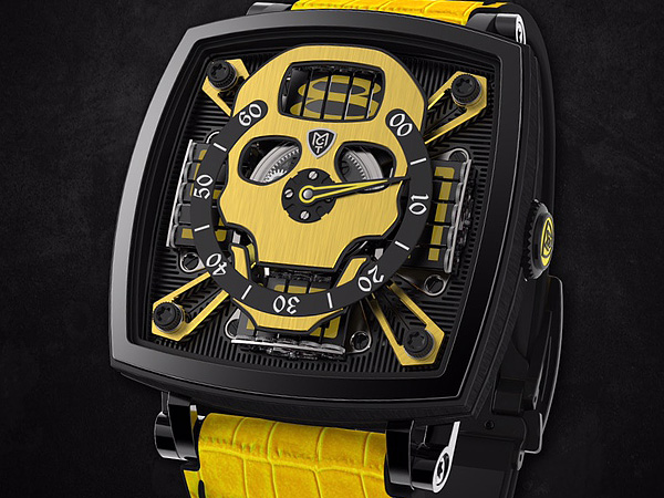 45.00 x 45.00毫米,中央厚度為15.5毫米,邊緣厚度為6毫米。5級鈦金材質搭配DLC類鑽碳塗層50個零組件。水晶玻璃: 藍寶石水晶玻璃表鏡,經雙面防眩光處理。表底蓋水晶玻璃經單面防眩光處理。中央藍寶石水晶玻璃/ 棱柱體小時序列顯示,270度分鐘指示區/MCT-S1.0.手動上鏈機芯,由MCT研發和組裝。37.40 x 37.40毫米(16 1/2法寸),厚度10.75毫米(搭載模組),471個元件。橋板和底板經手工倒角打磨,飾有“日內瓦波紋”或條紋裝飾。寶璣曲線遊絲擺輪。專利動力累積系統。振頻每小時18,000次(2.5赫茲)。270度分鐘指示區域。動力儲存50小時。81顆紅寶石。 旋轉式分鐘指示鋁錶盤結合黃色骷顱頭,小時由4個顯示模組,每個模組均由5個棱柱體組成/黃色小牛皮錶帶,配防敏襯裡,雙行手縫線,不銹鋼折疊錶扣/防水功能: 30米/全球限量一只。