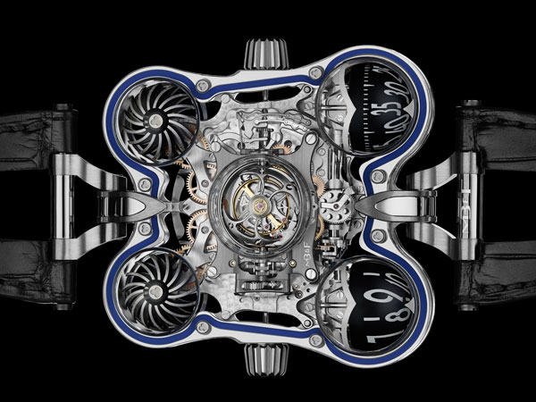 51 x 50 x 22.7毫米,950鉑金/側邊則以貴金屬錶殼帶穩固將兩塊清澈透明的藍寶石水晶板固定層疊,78個零件組成/由 MB&F 與製錶師David Candaux 攜手為 HM6 獨家設計之 3D 立體腕錶引擎,飛行陀飛輪搭載伸縮式保護罩,色彩斑斕的藍色 pt 950 鉑金材質高階戰斧造型自動盤,由自動盤驅動的雙鋁合金渦輪,動力儲存:72 小時,震頻:18,000bph/2.5Hz,475枚零件,68 顆寶石/小時與分鐘分別顯示於半球面鋁合金面盤,左錶冠可控制開關陀飛輪保護罩,右錶冠為調整時間與上鍊,雙渦輪調節自動上鍊轉軸/11 片藍寶石水晶:9 片球型(時針與分針顯示共四片,渦輪四片,陀飛輪一片)以及一片藍寶石水晶透視底蓋/手工縫線小牛皮錶帶,搭配鉑金特製折疊錶扣/防水30米/全球限量10只(另有5N紅金版本,全球限量10只)
