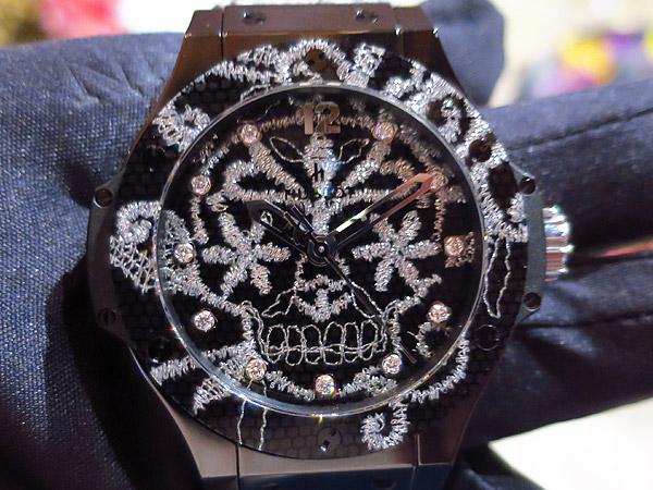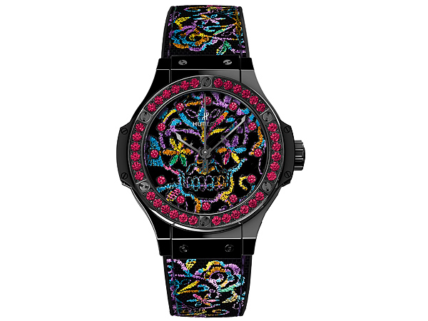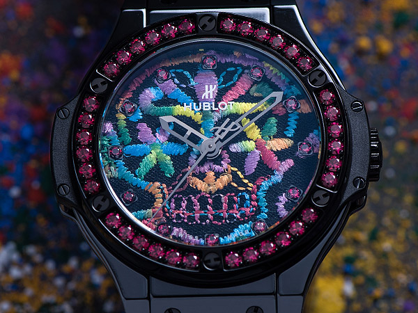 與HUBLOT合作的刺繡腕錶均結合了藤蔓花紋和摩登骷髏圖案,並賦予創新製錶科技的全新面貌,因而結合傳統與摩登的女性腕錶時尚,散發與眾不同的獨特性感魅力。”