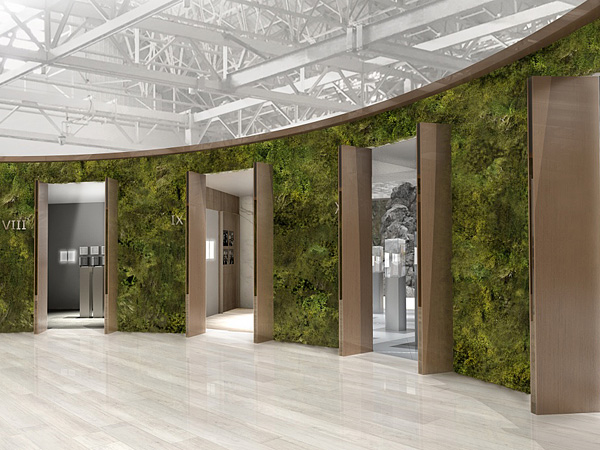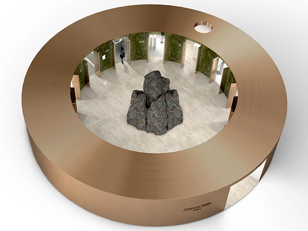 Lehanneur以大規模的鍍銅環狀造型設計了一座深具建築風格的出色藝術裝置,圍繞著以愛彼發源地汝拉山谷的岩石澆鑄複製而成的一組巨石,整個空間充分表現了錶廠對歷史地理學的尊敬。環形的巨石四周共有十二扇門,每一個房間娓娓道來一則屬於愛彼的故事:從品牌的創立至21世紀的今天,從製錶業跨足當代藝術,進而從汝拉山谷到中國。