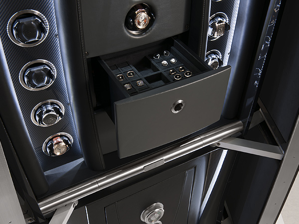 OBJECT OF TIME ONE-77採用鋁合金打造,漆面美觀鏡亮,內部採用華麗的Nippa皮革與Carbon飾板,正面上方中央圓形缺口設置BUBEN&ZORWEG 雕刻縮寫的15日飛行陀飛輪鐘,整體搭配LED燈光藝術設計,耀眼奪目,下方配置通過VdS 1認証的BUBEN&ZORWEG保險櫃,並具有藍牙技術的BUBEN&ZORWEG音響系統Monolog 10,是一款多功能的獨特產品。