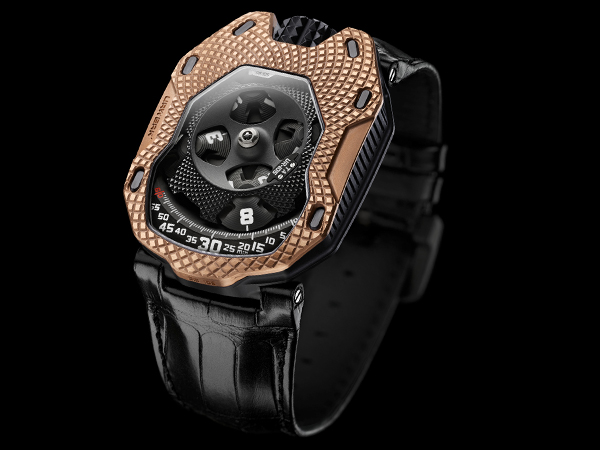 URWERK的共同創辦人暨設計師Martin Frei,也承認自己沉迷於黃金的魅力:「我心裡面總有一個小小的聲音,提醒我我有多麼喜愛這種金屬。即使科技不斷推新,時尚流行趨勢日新月異,新功能不斷研發,新穎材質,黃金就是黃金,它恆久存在,是讓我感到振奮的金屬。」這位設計師如此迷戀於這種永恆、永無缺憾的金屬,也啟發出這款全新UR-105 Raging Gold 錶款的誕生。獨特圖案刻印的紅金錶層,成為鈦質錶殼上的錶圈設計。