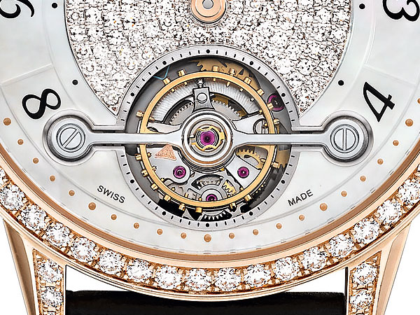 此外,透過幾何學與動力學的研究,選定最佳的深度,並找出止動桿末端的正確角度,使得配戴者能夠精準設定秒鐘的時間,同時確保機芯的立即啟動。快速停秒裝置可在不影響陀飛輪框架的情況下瞬間掣停擺輪,避免擺輪繼續擺動而影響腕錶的精準度。所有功能和操作都可透過3點鐘位置的錶冠進行操控。