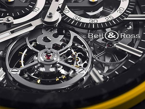 BR-X1 RS16鏤空陀飛輪計時碼錶的機械亮點,無疑是6時位置的陀飛輪,柏萊士在陀飛輪框架上發揮創意,融入了品牌Logo中的“&”標誌,辨識性非常高。值得特別一提的是,陀飛輪的運作,首重平衡,整個陀飛輪裝置若配重不平衡,運作就難以順暢。而這個“&”標誌的框架本身就不是對稱的,因此配重需要精細的計算調整。這也是技術難度所在。