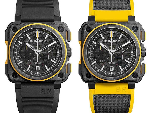 另一款BR-X1 RS16鏤空計時碼錶則是將9時位置的30分鐘計時針盤做了變化,針盤裡面的指針改以鏤空碟盤的型態來表現,細看這個碟盤的造型宛如方向盤的樣貌,這又是一個連結賽車概念的設計!啟動計時功能時,鏤空碟盤將隨之轉動,藉由上面的黃色標誌來顯示累計的分鐘數。黑色的日期環也做了鏤空設計,這是現代微型工藝科技的成果,本身就很有機械美感。