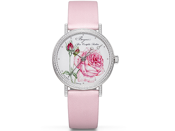 而這只獨一無二Classique Rose de la Reine琺瑯微繪腕錶選中其中最艷麗的玫瑰品種「Rosa Centifolia Bullata」,又稱雷杜德玫瑰,將其特質凸顯得淋漓盡致。為了完美詮釋那秀麗的花苞,寶璣工坊的藝術大師們特別採用琺瑯工藝。事實上,從過往的部份款式就可看出品牌早已掌握了這項特殊工藝,這件作品則是又一次展現了品牌爐火純青的工藝技術。