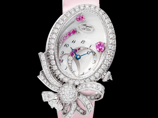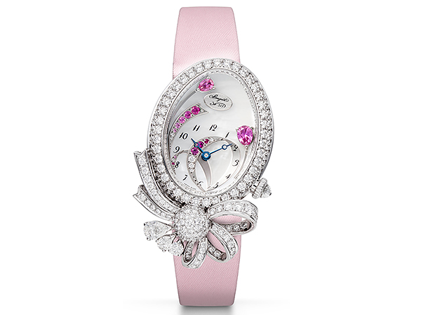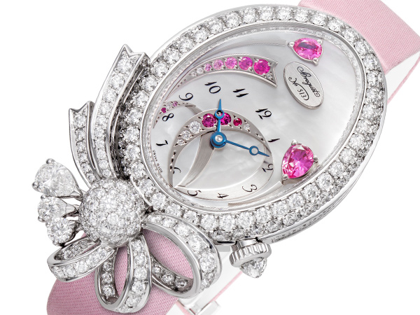 這只精美的腕錶在面盤上鑲著不同尺寸的粉紅水晶,而且相當巧妙地依寶石色澤排列出層次。寶璣工坊的大師們將瑪麗皇后禮服上最具裝飾性的蝴蝶結融入設計中,把18K白金雕琢出蝴蝶結造形,並且鑲滿美鑽。這個精巧裝飾完美地緊依著腕錶六點鐘位置的錶殼線條,與鑲著明亮式切割鑽石的錶圈及天然珍珠母貝製成的面盤相互輝映。
