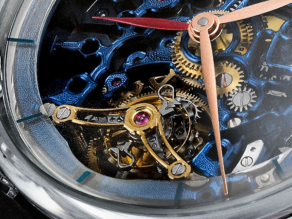 這枚完全鏤空的機芯經由化學氣相沉積(CVD)過程表面呈現藍色。叫人意想不到的設計結合了現代感十足的橋板結構、鎳銀機芯以及令人聯想起傳統高級製錶工藝的藍色表面修飾。經由手工打磨的機芯由冒險者系列的超薄錶圈所包圍,透過帶有時標的藍寶石水晶內錶圈完整展示於世人面前。