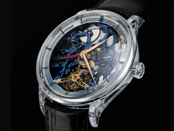 這枚傑作配備採用全新鏤空機芯、完全由藍寶石水晶打造的錶殼以及3D列印技術製作的錶帶,全球僅只一枚。但對Laurent來說,「只有一枚是不夠的」,於是他委託總部位於沙夫豪森的製錶廠打造另一枚採用藍寶石水晶錶殼的腕錶,且設計比前作更要大膽。