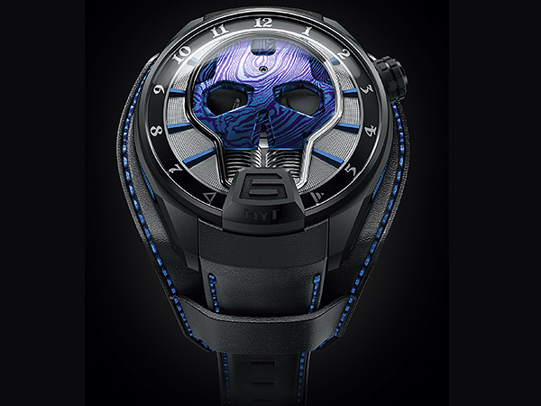 面盤:大馬士革鋼骷髏頭經藍色PVD處理,飾有鍍銠巴黎飾釘圖案,液體小時顯示