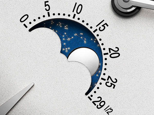 兩種款式分別對應玫瑰金或白金材質月相盤,透過錶盤下半部分的開放視窗,月相盈虧在星羅棋佈的背景下熠熠生輝。所謂月齡顯示,是指顯示自上一輪新月過去後所經過的天數,可通過環繞此視窗的刻度盤讀取。