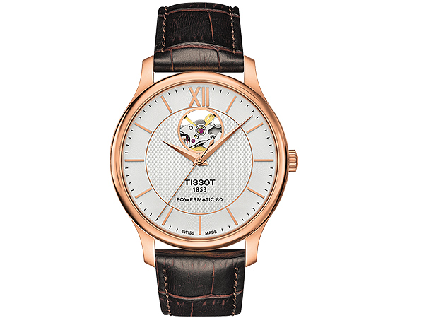 天梭駿雅系列開心自動男款腕錶,搭載Powermatic 80自動上鍊機芯,動力儲存達80小時,外型採用40mm錶徑設計,搭配316L不鏽鋼、玫瑰金PVD或雙色金等可顯華貴、可顯摩登,多種款式可供選擇,弧形錶鏡下放大時光運行舞台效果,簡約古典的面盤上運用羅馬數字時標、棒點刻度以及機刻花紋裝飾,烘托出12點鐘位置開心視窗擺輪的能見度,當人細究其結構縱深,不論從正面或錶背皆可玩賞機械錶的機芯運作之美。