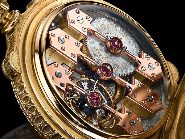 而另一款三金橋陀飛輪鑽石腕表,亦是向誕生於十九世紀中葉誕的傳奇時計致敬。41毫米金表殼比例恰到好處,舒適貼服,三條箭形金橋耀眼迷人,人手修飾不容半點瑕疵,只有少數製表師可以駕馭,金橋的倒角弧度及拋光絲毫不差,精確細緻之處令人激賞。鑲嵌於12毫米直徑框架內的陀飛輪由72個零件組成,所有零件經細緻修飾,上下框架及擒縱系統夾板經人手倒角及拋光,擺輪裝配金微調螺絲,擺頻精準無誤。